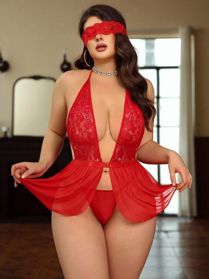 Kadın KırmızıTül Dantel Detaylı Mini Büyük Beden Gecelik